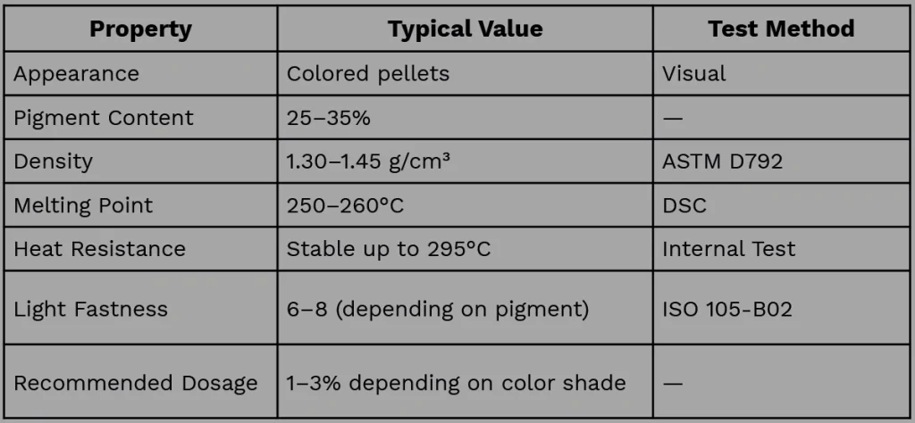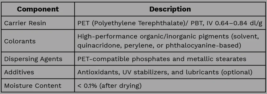 Our PET-Based Color Masterbatch is designed to provide vibrant, consistent coloration for polyester fibersand filament yarns. Formulated with high-viscosity PET resin and high-performance pigments, it ensures excellent dispersion, color consistency, and processing stability during melt spinning.