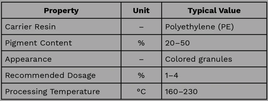Color Masterbatch formulated with polyethylene (PE) as carrier resin, designed for LDPE, LLDPE, and HDPE applications. Offers excellent color consistency and dispersion for film, blow molding, and extrusion processes.